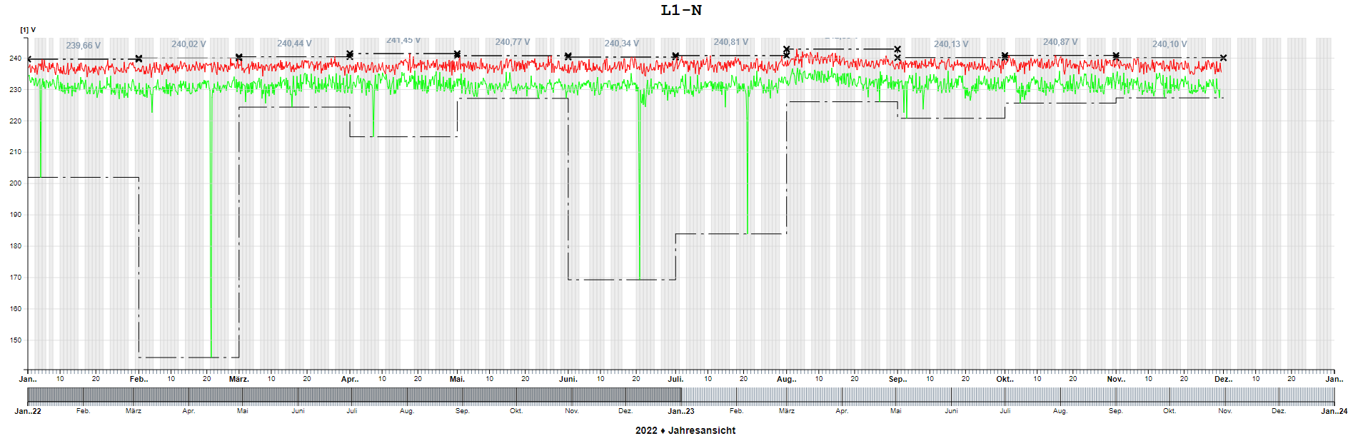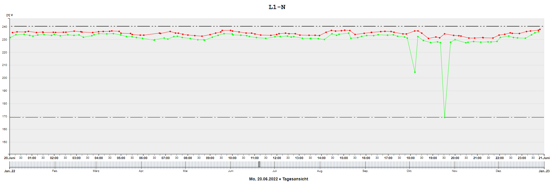 Zu sehen ist eine Jahresansicht mit den beiden Extremwerten für Spannung L1-N Max (rot) und Spannung L1-N Min (grün). In dem Diagramm wurden zusätzlich zur Verdeutlichung die Monatsextreme eingeblendet. Man sieht rasch die Ausreißer nach unten, währen die maximale Spannungsspitze im Normbereich bleibt. Im nächsten Bild nochmal die Anzeige des einzelnen Tages: