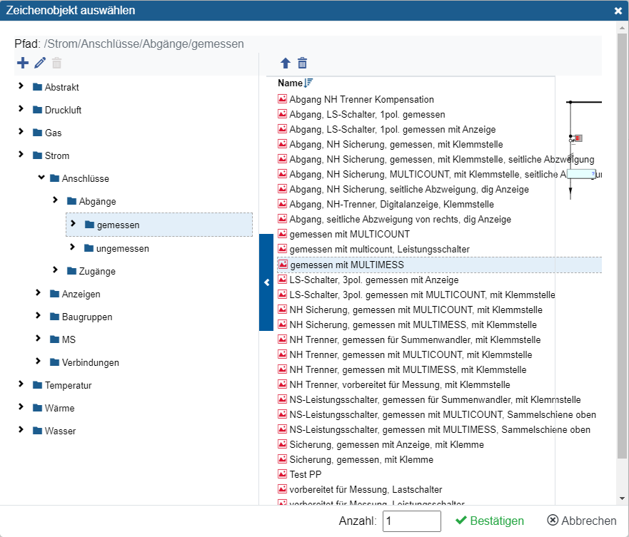 - Abgang -> Verbrauch. Wird verwendet, wenn das Zeichenobjekt finalen Verbraucher repräsentieren soll. Hier zugeordnete Zählpunkte stehen zur Verwendung in Kostenstellen bzw. Energienutzen zur Verfügung.
