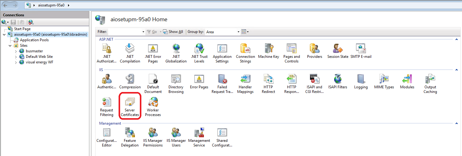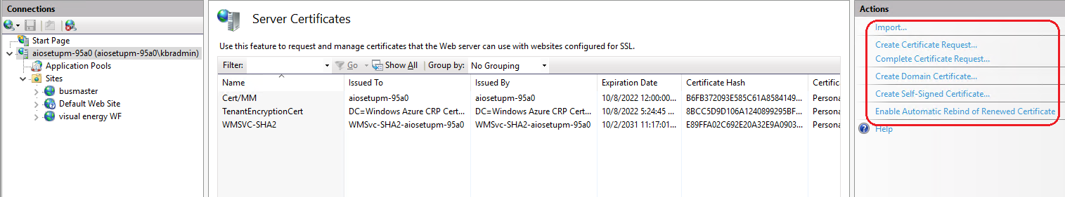 Bereits mit der Installtion wird beim IIS ein automatisch erzeugtes (selbst-signiertes) Zertifikat im Zertifikatsspeicher abgelegt. Wird beim Setup von visual energy die Option https-Bindung ausgewählt (Standard), dann wird automatisch das erste vorhandene Zertifikat aus dem Zertifikatsspeicher verwendet.