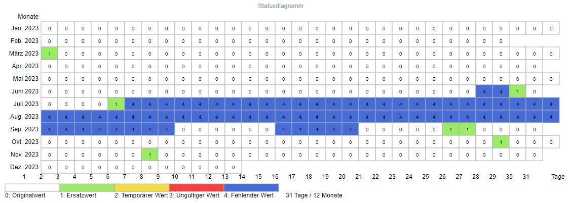 Mit dem Status-Diagramm kann für eine oder mehrere Messgrößen die Statuswerte für einen Zeitraum übersichtlich in einer Heatmap dargestellt werden.