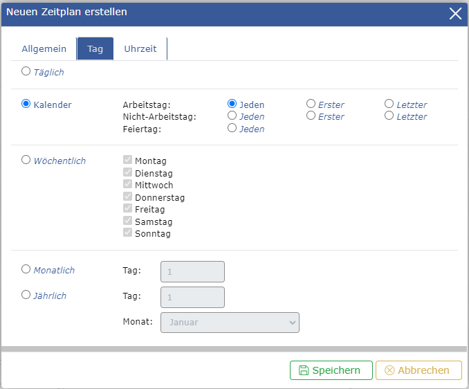 - Grundsätzlicher Zeitraum (Start) der Gültigkeit eines Zeitplans,sowie Definition der Uhrzeit für die Ausführung.
