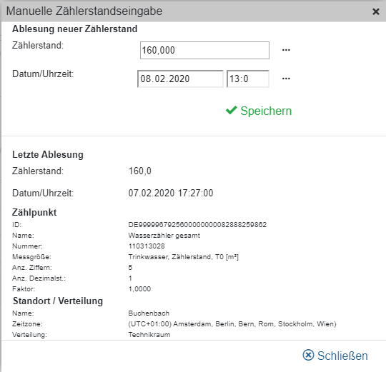 In Einzelfällen kann es notwendig sein, den abgelesenen Zählerstand einer einzelnen Messstelle direkt ins visual energy System einzugeben. Speziell für den OBIS Typ "Zählerstand" ist ein Eingabeformular implementiert. Dieses Formular kann auch per Direktlink im Browser geöffnet werden. Damit besteht die Möglichkeit, dass Sie oder das System den Link per E-Mail an einen Ableser senden und diesen damit zur Ablesung auffordern.