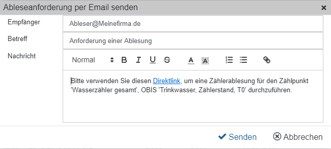 Der Menüpunkt Ableseanforderung per E-Mail senden erlaubt direkt vom System eine Mail an einen Ablesen zu senden. Die E-Mail kann vor dem Senden bearbeitet werden.